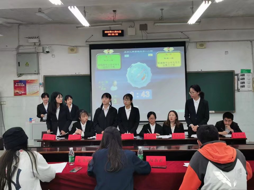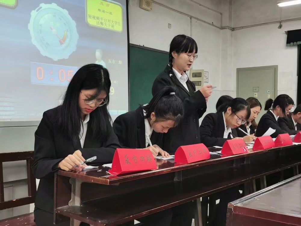 “文心杯”新生辩论赛半决赛第一场在经管楼201教室举行。正方中文一班和反方新闻一班就“短视频平台对大学生活利大于弊/弊大于利”展开辩论。到场评委有19级兴湘学院辩论队辩手包雨臻、19级外语学院辩论队辩手阳雨婷、19级机械学院辩论队辩手骆劼。