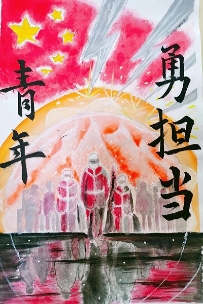 电子海报作品同样元素丰富、创意十足,其中19级中文一班王欣同学的《战役必胜》以红色为基调,为全球抗疫加油,传递出了人类命运共同体的理念。19级新闻二班赵学玉同学的作品两侧分别是微笑的女孩和医护人员,作品紧扣活动主题,表达了对医护工作者的尊敬和对疫情结束的期盼。18级新闻二班李经旻同学的《青年·为战》,以奔跑的红色人影和医护人员为主体,海报右上角的梅花有着“梅花香自苦寒来”的寓意,表达了对抗疫人员的崇敬之情。