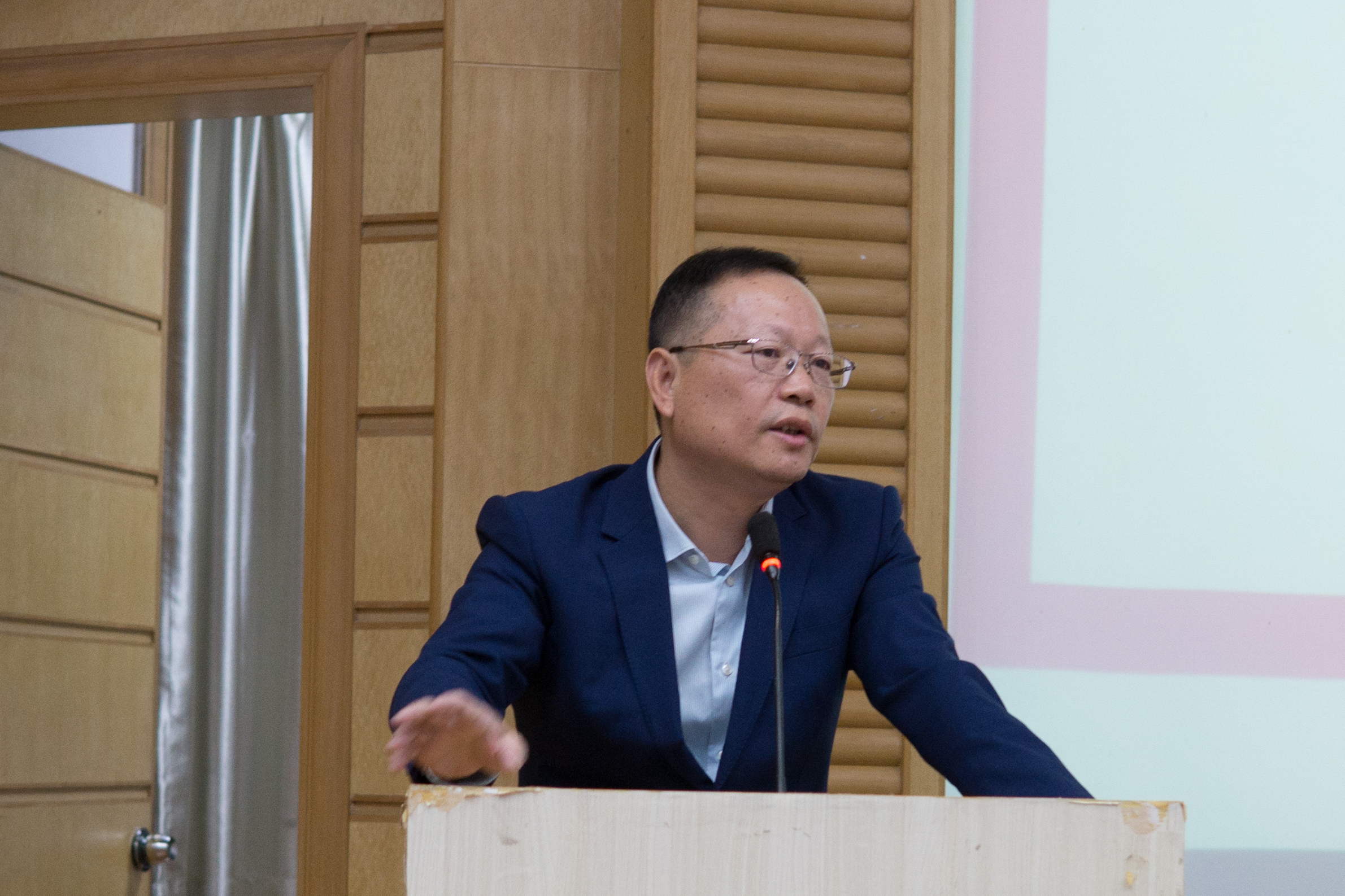 副院长田华为大家进行入学教育的讲解。田华老师以从学院发展情况、严格培养计划、学术道德和不懈努力四个方面介绍了学校对研究生的培养计划和相关注意事项。为新生们应该如何开启在湘大的研究生生活做了详细的讲解,表达了对新生研究生的希冀。