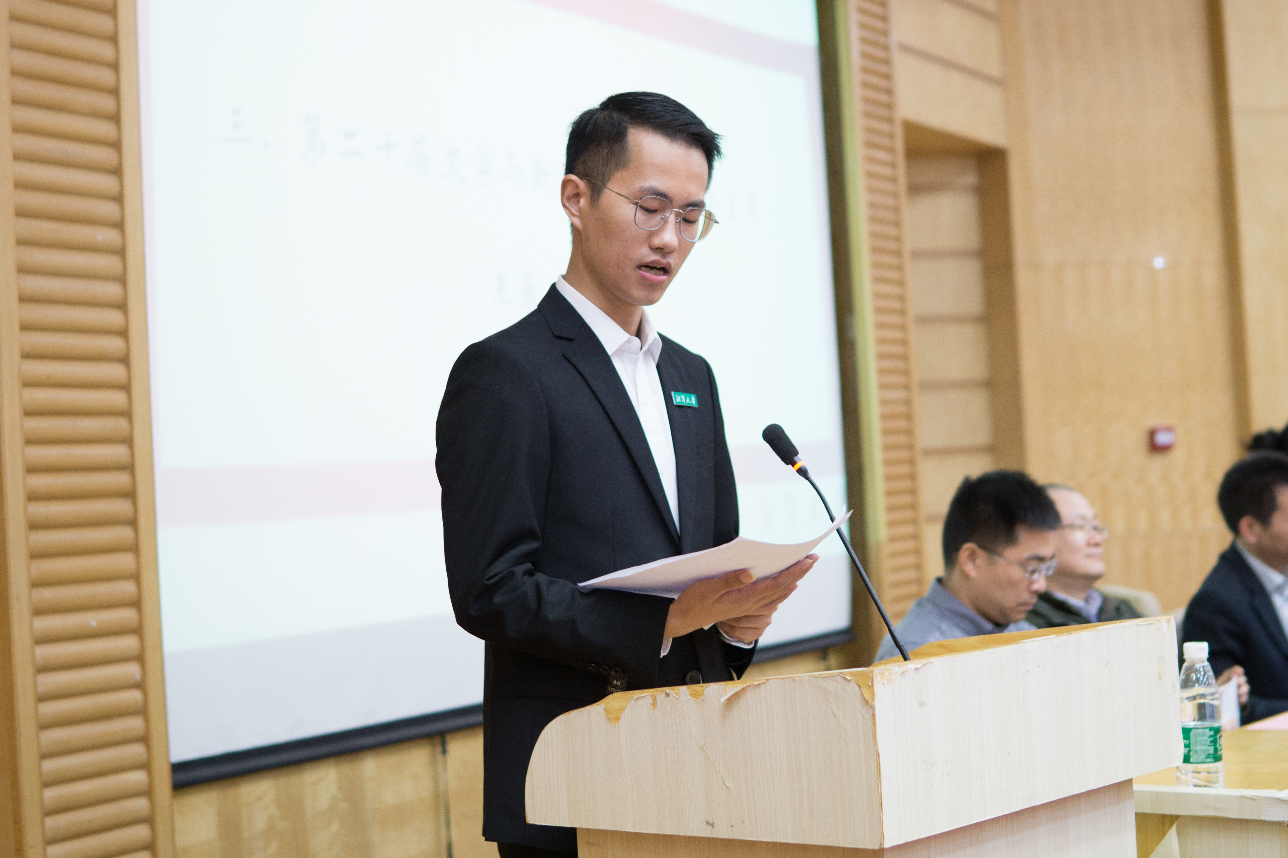 第二十届研究生团总支、研究生会换届大会。研究生辅导员林瑜老师宣读第二十届研究生团总支、研究生会学生干部名单;老师们为第二十届学生干部们颁发证书;51大赛
