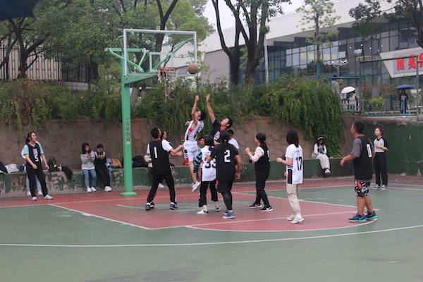在第一节比赛准备阶段,天空飘起了小雨,但空气中却弥漫出大赛即将开始的紧张气息,双方球员跃跃欲试,球场上的热情在飘着雨点的空气中更加凸显。随着一声哨响,队员们等待已久的比赛正式开始。双方队员立即展开了角逐,你追我赶的激烈对决瞬间带动了场上所有人的激情。几轮进攻防守后,双方队员都进入了更好的状态。17新闻广电瞅准一个时机率先进得一球,拿下首杀。19中文3班不甘示弱,2号队员吴银萍在下一轮进攻中迅速从对方球员中抢得球,拿下四分。接下来,双方队员毫不相让,19中文3班略显被动,在第一节比赛结束时,17新闻广电以22 :6暂时领先19中文3班。