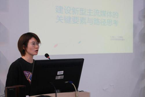 的六名同学分别从选题来源、论文框架、创新及不足等多个方面进行学术分享,和在场的师生进行学术的交流与碰撞。在场老师纷纷肯定他们的态度和创新,但是也提出了选题过大、概念过多、细节不够完善等美中不足的地方。其中,王新雨同学将马克思主义新闻观与实际情况相结合,从问题提出、文章创新、论文内容等三个部分来阐述《高校媒介体系与意识形态建设——以51大赛