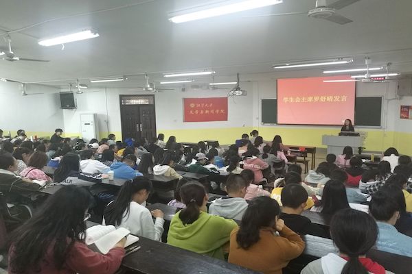 学生会主席罗舒晴同学发言。她引用“大学之道,在明明德,在亲民,在止于至善”,让同学们深刻认识到治国应先修身立命,因此大学生应兼顾学习和社会实践。学习是学生本职,在处理好学习的情况下也要积极参加课外活动。罗舒晴同学的讲话使在场的同学明确了大学生活的目标,也坚定了向党组织靠拢的信念。