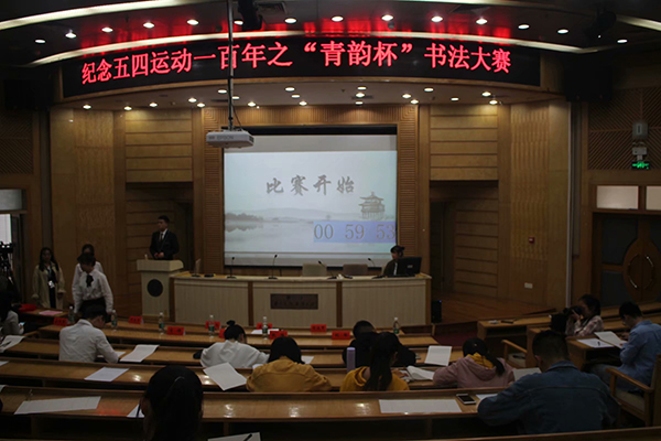 联合举办的纪念五四运动一百周年之“青韵杯”书法比赛决赛在图书馆报告厅举行,本次比赛由周思冲同学主持。