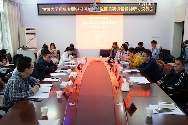 党委副书记周鹏飞等人立足自身工作实际,阐述了对于做好青年工作的认识。申永丰结合习近平总书记在校庆60周年前夕对我校做出的重要批示,阐释了湘大精神的内涵,鼓励青年学生奋斗要实、奋斗要勤、奋斗要久、奋斗要新。吴彬彬以多年团学工作经历,鼓励学生们既要仰望星空,也要脚踏实地,从日常小事做起践行爱国情怀。周鹏飞要求大学生正确处理好“小我和大我、目标与行动、单干与协作、书本与实践、传承与创新”六大关系,让大学生活更出彩。