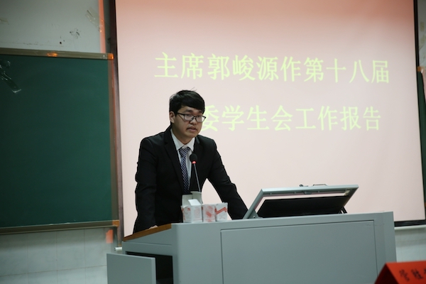 第十八届团委学生会主席郭峻源同学作2018年度团委学生会工作报告。他总结了2018年度团委学生会各方面的活动成果,表达了对领导老师、学生干部和积极参与活动的同学的感谢,并对即将产生的新一届学生会主席团成员提出寄望。随后,团委学生会团委第一副书记李倩同学就团费收缴使用情况作了详细报告。