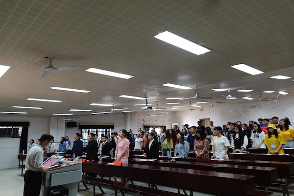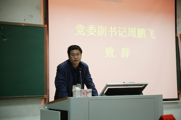 全体师生齐唱国歌后,院党委副书记周鹏飞老师致辞发言。周书记高度肯定了过去一年51大赛