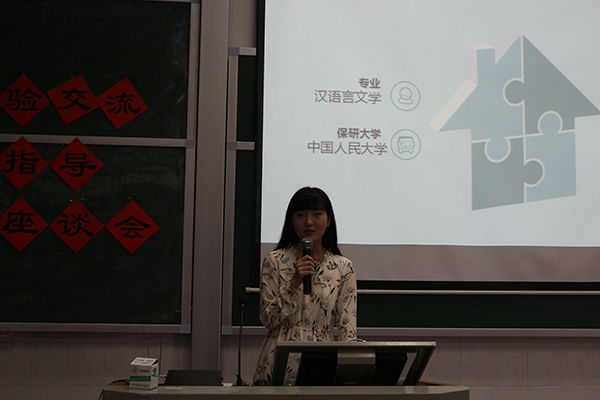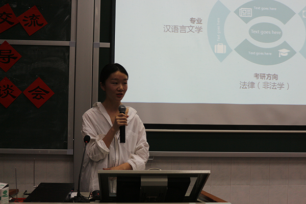 中国语言文学的王菊玲学姐,她主要讲了考本校的优势以及学习方法,并针对自己的考研经验为同学们建言献策。在提问环节,针对同学们的各项问题,她们还分享了答题技巧等等。
