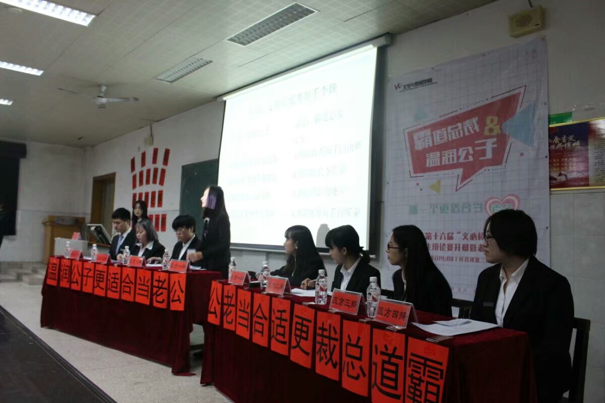 接着反方一辩闫雨昕陈述己方观点。首先她反驳了正方一辩所言“霸道总裁不如温润公子”的观点并细数霸道总裁的爱是如何的珍贵,这种霸道的爱反而让人觉得甜蜜。其次,她强调霸道总裁在财力方面给婚姻带来的保障会给人以安全感。最后她坦言:“为什么霸道总裁适合当老公,因为弱水三千,只有你是唯一。”正方四辩李金城对反方一辩进行了质询,他坚持“温润公子温柔的爱胜于霸道总裁强势的爱”这一观点。