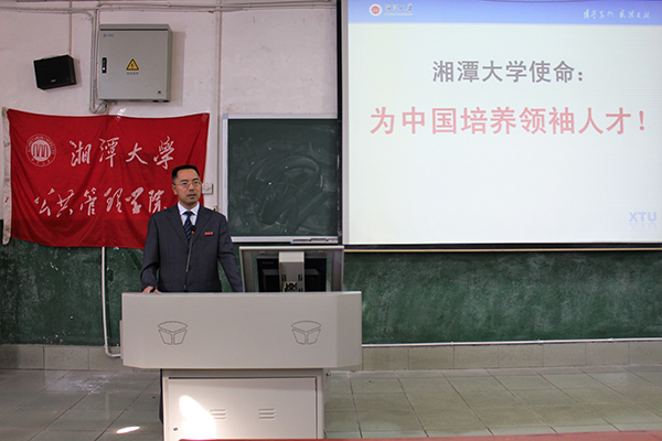 公共管理学院肖湘雄教授。肖教授为此次授课选取的主题是:新时代青年的价值追求与责任担当。在授课开始前,肖教授表示,能来参加这次课堂授课,既是他的荣幸,同时也深感压力。肖教授说,希望通过此次一个半小时的课,和大家多交流沟通,将一个个疑问号变成一个个惊叹号。台下掌声热烈。
