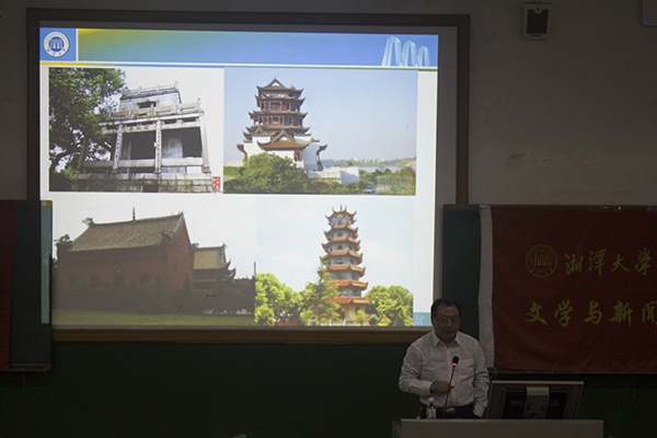的优秀毕业校友举例讲起,生动讲述了湘大办学至今的优秀历史,以此激励在场的各位同学成为湘大的中坚力量,并在毕业以后成为湘大的铁杆校友。然后,刘建平教授又着眼于湘潭的历史文化文脉,地理背景等,如数家珍般讲述了三湘四水、湘潭古城等湘潭文化,讲述了湖湘文化强调“经国济民,经世致用”的特点,体现了湘潭人杰地灵。刘建平教授深厚的知识底蕴,娓娓道来的历史故事使得现场掌声不断。