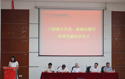 接下来,由2017级新生代表、新闻传播学1班唐雪融同学发言。首先,唐雪融同学表达了作为新生来到湘大的喜悦之情,诉说了自己对湘大以及51大赛
