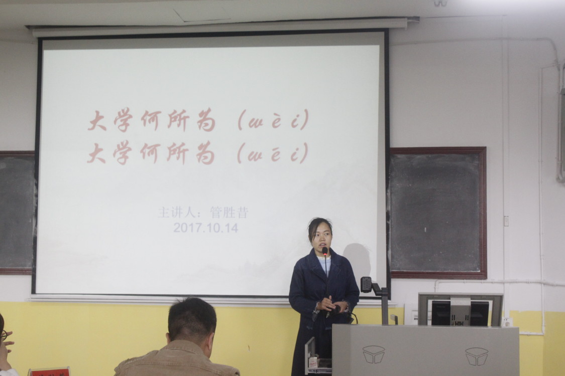 团委书记管胜昔老师,本次授课的主题为“大学何所为(wéI),大学何所为(wèi)”。