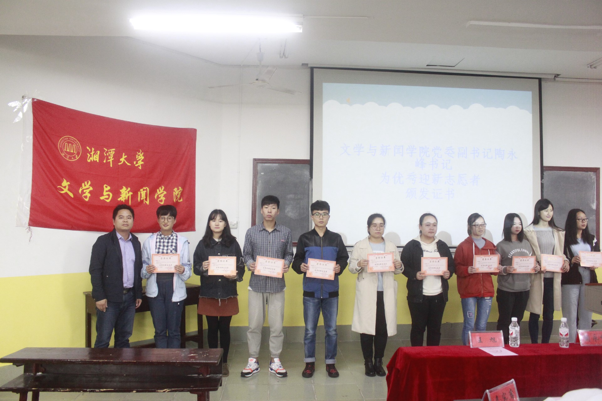 的护书活动始终积极开展并获得了广泛认可。青志部还组织开展了寝室绿色行动,简单的废品变卖和捐款却让贫困学子感受到了来自湘大的温暖,也展示出了当代大学生应有的风采。共建梦想社区、爱心血库、湘江行、关爱孤寡老人与留守儿童等等各色活动,为社会送上了一份又一份温暖,用实际行动证明了一颗颗善与爱的种子已在大学生心中生根发芽。活动中也涌现出了一大批优秀志愿者,王海华、马志远、丁振兴等多位同学分别获得优秀迎新志愿者荣誉,由陶永峰书记亲自为他们颁发证书。同时,管胜昔老师、王旭老师为新上任的“共建梦想社区”志愿者发放了志愿者聘书。