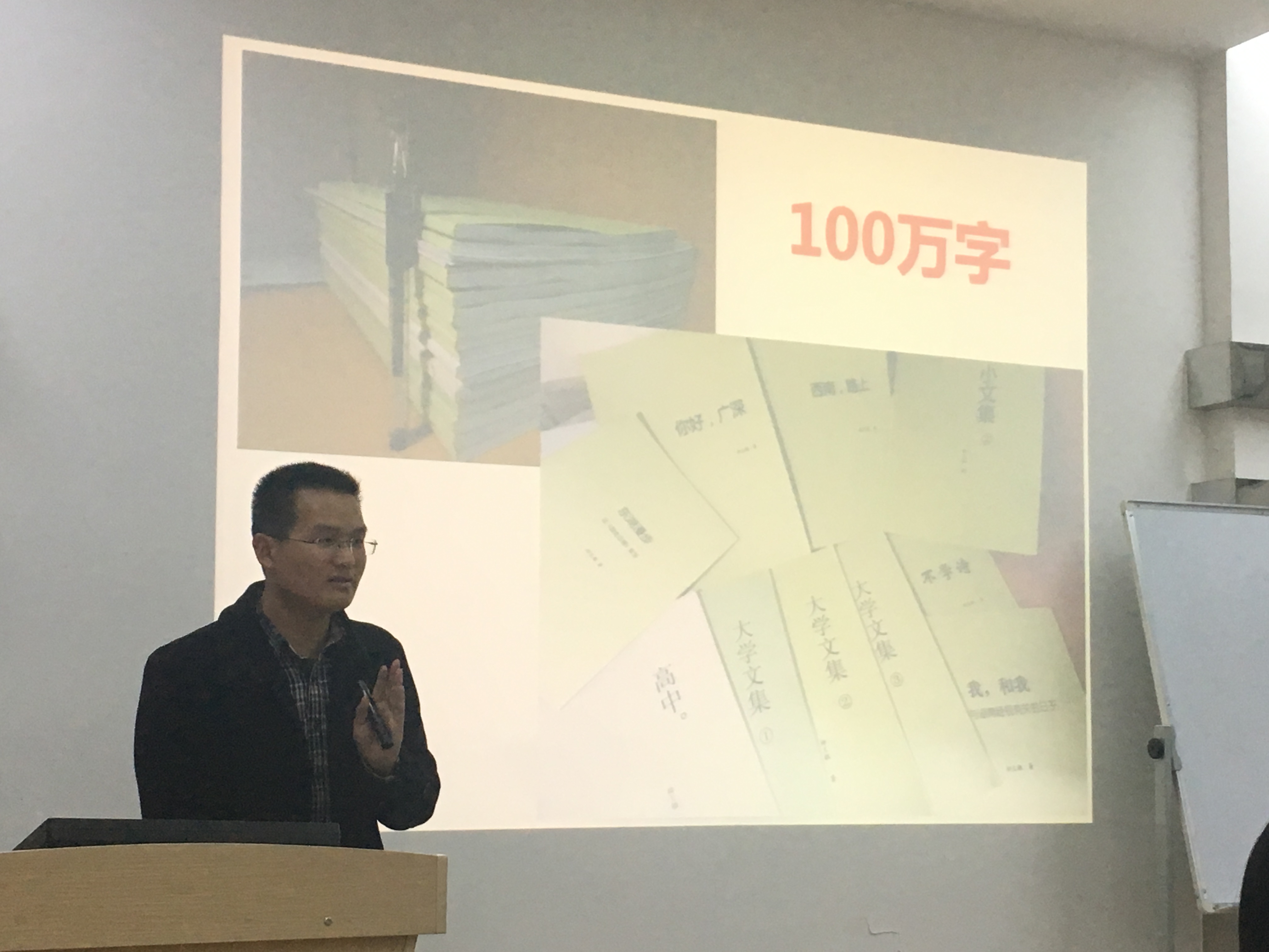 首先上台的是14级古代文学研究生柳王敏,他所讲的主题是《我心依旧爱写作》。他结合自己的从高考到读大学以及实习工作期间的亲身经历,向在座的同学们分享了他的写作初衷、写作内容、创作原则以及在写作过程中的感悟。通过一个个鲜活有力的故事,柳王敏让在座的同学们充分认识到了写作的重要性与必要性。他认为“写作是文科生的生命”,写作已经融入到了他的生活中。他送给同学们一句箴言:“能够抵挡岁月侵蚀的,唯有才华。”