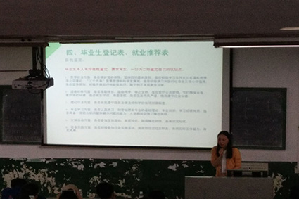 随后,杨洋老师为毕业生们讲解关于毕业及就业的一些注意事项。杨老师针对就业协议书、毕业生们的档案去向、毕业证的发放、报到证、户口等相关问题进行了详细说明。杨老师再三强调不要遗失报到证,改派流程最好一次确定。毕业生们都认真聆听、详细记录了这些注意事项。接着,杨老师对部分毕业生的提问进行了答疑。