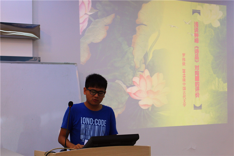 第二位上场的是来自古代文学的罗伟倓,他带来的是《浅谈< 诗品>对陶渊明的评价》。钟嵘以“其源出于应琚,又协左思风力”评价陶渊明,而自古以来历代诗论家对此多有微词,认为“品陶不公”。罗伟倓根据自身的理解,分析陶渊明艺术作品、不同时代的文学观以及陶渊明作品被接受情况等各方面来谈《诗品》对于陶公的评价。