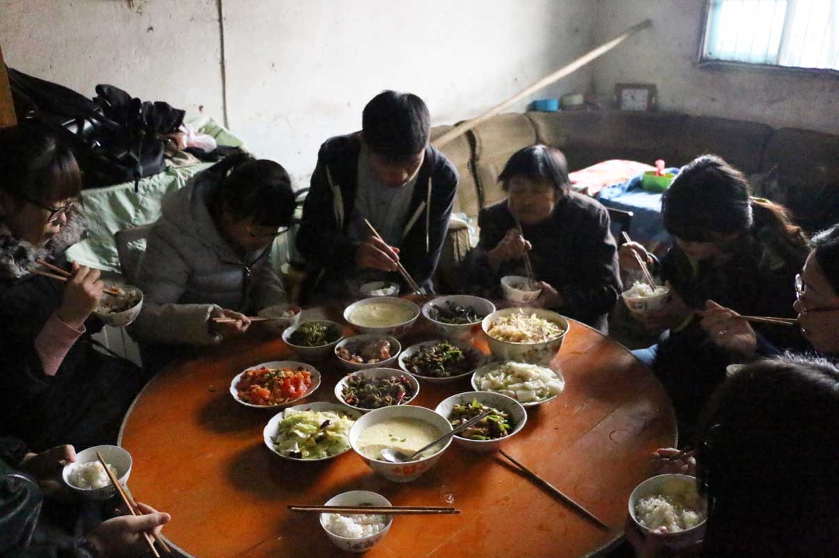 十点左右,志愿者们便开始为爱心午餐忙碌起来,摘豆角、折香菜、打鸡蛋、切肉片全都不在话下。洗菜的水刺骨冰凉,厨具很是缺乏,但这都没能难倒志愿者们,大家分工明确,互帮互助,只为在这寒冷冬日,为爷爷奶奶们呈上一顿完美的爱心“盛宴”。孜然牛肉、柿子炒蛋、红烧鲫鱼、清炖排骨、火腿蒸蛋、手撕包菜......都是志愿者们的丰硕成果。爷爷奶奶对志愿者们赞不绝口,大家围坐在热腾腾的饭菜周围,在欢声笑语中享受着这顿爱心午餐,像是其乐融融的一家人。看到爷爷奶奶们的好胃口,志愿者们便也不觉辛苦了。