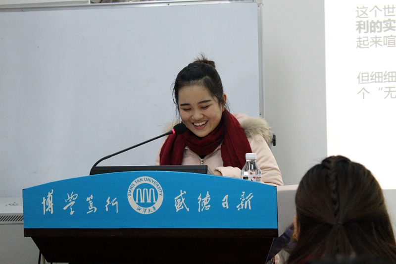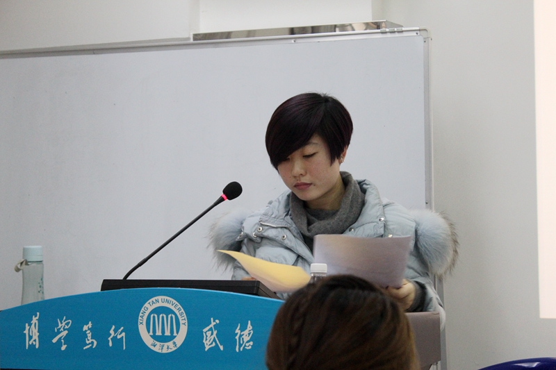 新闻传播学专业的陈云霞同学,她带来的是自己在湘大几年学新闻的体会。她带着批判的眼光,解读自己眼中的新闻学和新闻理想,引发全场的热切讨论。讲罢,杨文博主席首先对陈同学的思路和ppt提出了修改意见,唐晓玲老师上台整体点评了陈同学的发言,鼓励大家多思考但要保持思想的正面性,多多传播正能量。唐老师还以自己的亲身经历告诫大家要加强各方面知识的学习,克服畏难情绪。