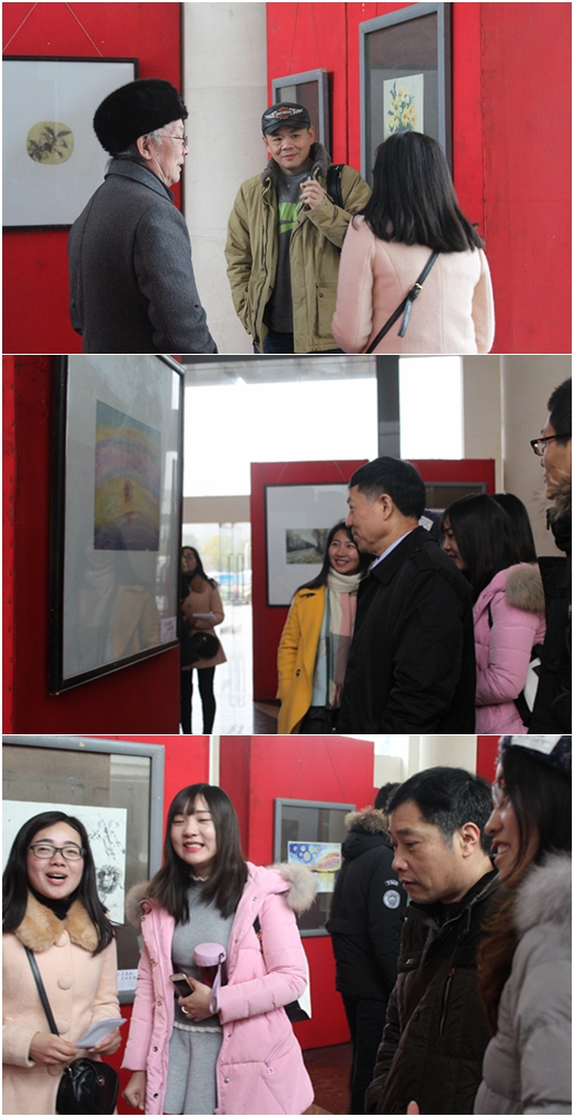 绘画是一门艺术,更是创作者内心情感的自然流露。老师们在开幕式前由画作的作者们带领参观了部分画作,并对大多数第一次拿起画笔的同学的画作给予了肯定,老师们在欣赏画作的同时也看到了同学们对于绘画的坚持与用心。