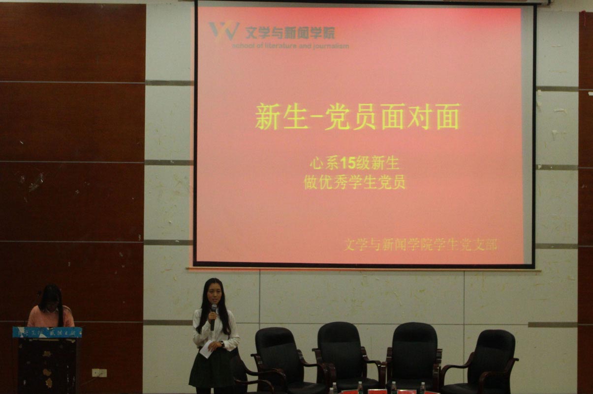 全体15级新生和党支部成员参加了本次活动。优秀党员12级汉语言1班王学彤学姐、12级新闻1班徐琳燕学姐、12级广播电视学1班徐佳超学长、12级广告2班张美文学姐的分享了他们精彩的大学生活。