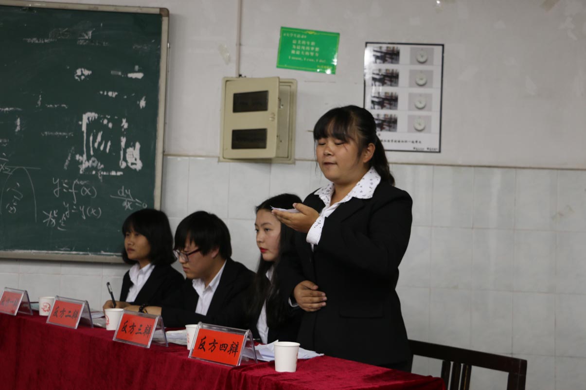 在随后精彩激烈的自由辩中,正方辩手首先就对方质询环节中对法律的过分强调进行反驳,之后双方分别就本方观点向对方提出问题。正方则以上课迟到为例,举例如果一位同学明明不想旷课,但是因为有事而旷课,实际上还是旷课。这个例子说明了一个人想要扶起来摔倒的老人,但是因为道德缺失却还是没有做到,这就证实了道德水平的重要性,举例生动形象。而反方则坚持自己的观点,认为法律才是解决道德缺失的根本途径。反方辩手谢可悦可谓气魄十足,她针对对方提出的“不敢扶”和“不想扶”做出又一次的解释,思维敏锐、思路清晰,赢得了台下的阵阵掌声。