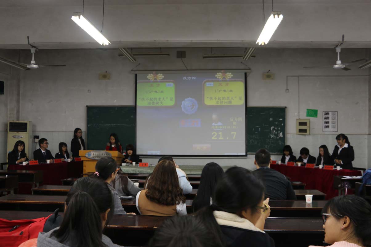 本场辩论赛,双方的辩题是“扶不起的老人”是道德缺失还是法律问题。围绕这一问题,作为正方的广电一班的观点是“扶不起的老人”是法律问题;广电二班作为反方,观点则是“扶不起的老人”是道德缺失。双方辩手分别为:正方一辩徐瑜璐 、二辩王巧 、三辩朱余苏、四辩孙惠;反方一辩梁慕仪 、二辩吕昕蒙 、三辩李姝 、四辩谢可悦。李雅婷担任主席。