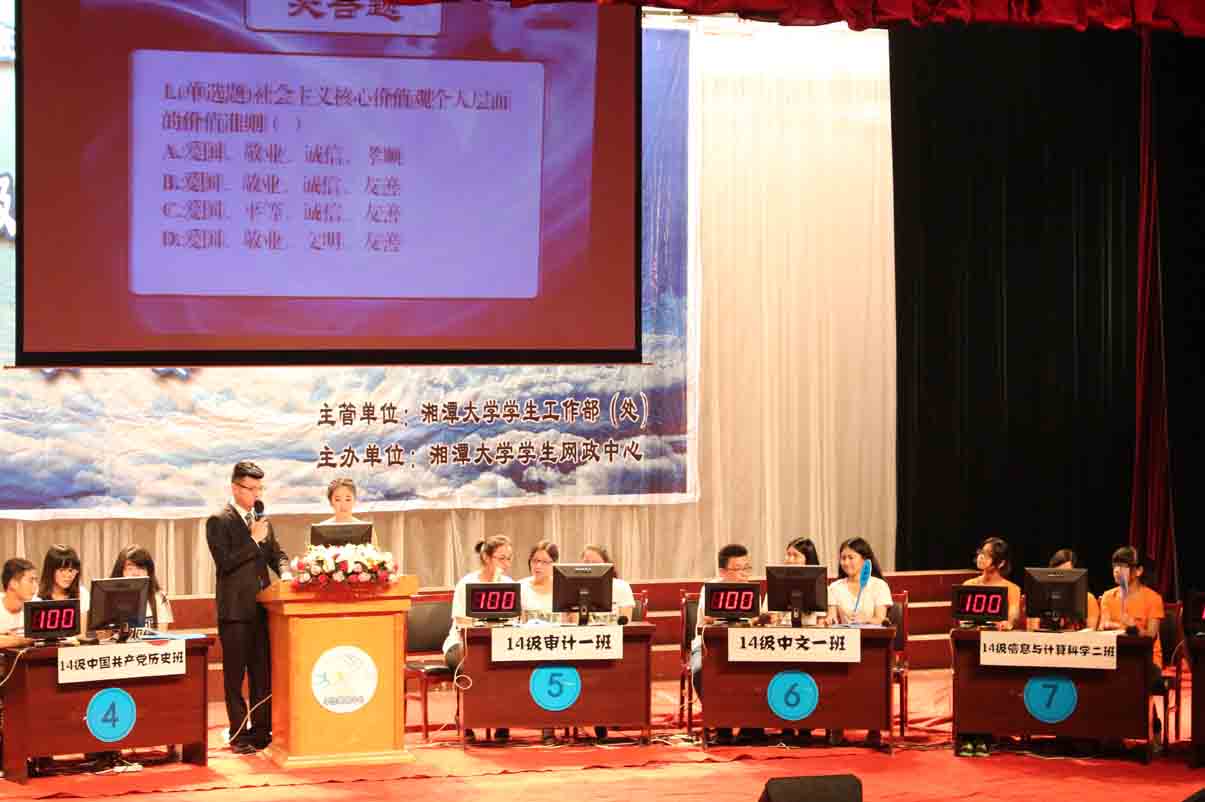 参赛班级中文一班沉着冷静,机智应答,最终得分为140分,同最高分14级行政管理二班相差三十分。第二轮比赛为“抢占先机(抢答题)”。14级中国共产党历史班在本轮中表现抢眼,多次获得抢答权,和14级人力资源管理二班共同夺得本轮最高分180。51大赛