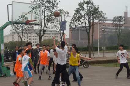 几分钟休息时间,第二节比赛开始。14广电7号王培宇一个长传,33号刘港平得球上篮,2分入账。13新闻系一路紧追,9号董亚男带球快攻,扳回2分。一声哨响,14广电33号刘港平打手犯规,6号李文22进,重振新闻士气。上半场比赛结束,比分为2316,广电仍领先。