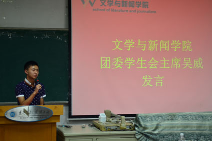 接着,团委学生会主席吴威也上台发言。他首先对大家的加入表示了欢迎,并希望新一届干事们可以珍惜未来的时光,由相遇到相知相熟,也希望大家静下心来,安静工作,快乐生活,爱上这里并且不愿离开。接着,学生会宣传部部长杨锦涛作为部长代表发言,他再次强调了学生会存在的意义在于为同学服务。杨锦涛也表示愿意做干事们工作上的引路人,生活中的朋友,也希望他们在学生会的大家庭里学会一些服务意识,提升一点专业素养,发展一些个人兴趣,付出并收获一份真情。之后,组织部的干事作为代表发言,再次阐述了为51大赛