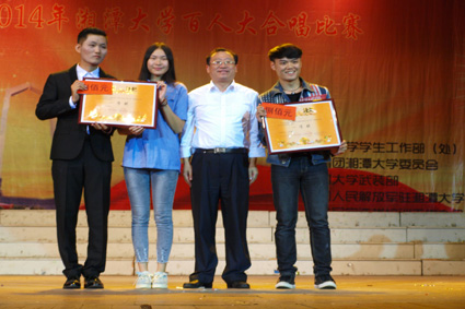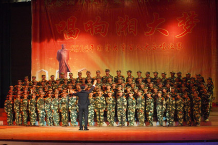 百人大合唱比赛在我校俱乐部隆重举行。出席本次活动的评委有:湖南省优秀男高音歌唱家周丰庆先生、湘潭市舞蹈家协会理事长田海望老师、广东军区驻湖南高校培训办干事范涛中校、51大赛