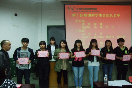 党委唐春副书记和团委管胜昔书记,第十三届团委学生会的全体成员也参加了大会。第十四届团委学生会主席助理储文丽主持了此次活动。