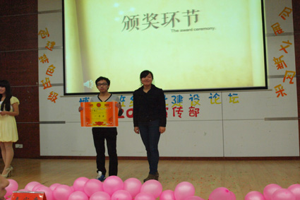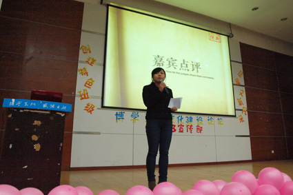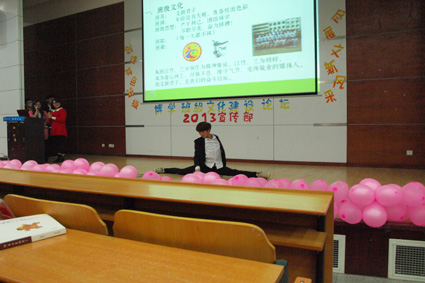 第八届班级擂台系列活动之“博学”班级文化建设论坛决赛在逸夫楼第二报告厅隆重举行,本届比赛共有13个班级参与比赛,经过初赛后,共有10个班级进入决赛。出席本次活动现场的领导和嘉宾为团委书记管胜昔老师及团委学生会主席团成员。主持人由胡磊磊、黄嘉惠担任。