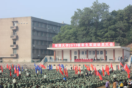 2013年09月29日上午8:30,秋高气爽,阳光明媚,我校2013级新生军训动员大会在第二田径场举行,大会按照升国旗、校领导讲话、广州军区领导讲话、军训新生代表及教官代表讲话的流程进行。我校副校长周益春,广州军区驻湖南高校选培办王福林上校,驻校军官范涛干事、陈石雄干事,副校级督导员刘建平等出席了动员大会。