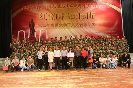 紧张刺激的比赛后是由校艺术团带来的《赶圩归来啊哩哩》,完美的歌喉赢得了场下一片喝彩。随后,全体起立共唱校歌,希冀湘大美好未来。观众互动深入了同学对红歌的理解,舒缓了比赛节奏。精彩的拉歌环节也为活动增添了不少色彩。