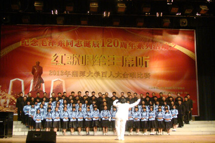 “东方红,太阳升,中国出了个毛泽东”,全体同学以一首洋溢着对毛主席无上敬意的《东方红》拉开了比赛的序幕。第一个出场的是公共管理学院,一首《太阳出来喜洋洋》,唱出了对太阳的礼赞,对生活的热爱。随后哲学系、历史系,机械工程学院,兴湘学院等共17个参赛团体依次登台演出。其中,机械工程学院的一首《大中国》融合了朗诵、武术元素,伴着铿锵有力的鼓点声,节奏感十足。另外,还有一些学院也在合唱之余添加了舞蹈、朗诵等元素。整场比赛高潮迭起,扣人心弦。