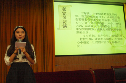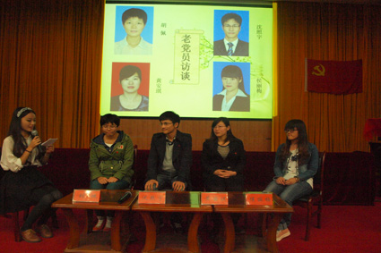 随后,活动进入核心环节——优秀党员访谈。来自中文、新闻、广告和广电四个不同专业的优秀学生党员胡佩、沈照宇、黄安琪和侯丽梅,与在场学生就学习、社团活动、实习及入党方面分享自己的经验与心得。针对大学四年对自己最大的改变和收获这个暖场问题,四个人都有自己不同的答案。胡佩认为这四年让自己学会了独立生存的能力。沈照宇觉得自己比以前更自信了。黄安琪认为自己在这四年中最大的收获是接触到了一个更大的世界和认识了一群志同道合的朋友。侯丽梅则说“我最大的收获是学会了用心做事。”接下来是单人访问环节。专业成绩一直名列前茅、曾两度获得年度奖学金的胡佩认为在学习中勤奋最重要。被问及学习经验时,她讲了三点:一是将学习简单化,二是目标计划行动,三是自主学习。然后,曾获得51大赛