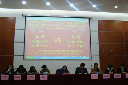 3月23日上午8点,我校第三届“百灵鸟”杯英语辩论赛暨第十七届“外研社杯”全国英语辩论赛校内选拔赛半决赛正式开赛,本次比赛的辩题为:“This house believes that gay parades do more harm than good to the gay community(同性恋游行对于同性恋团体的发展弊大于利).”
