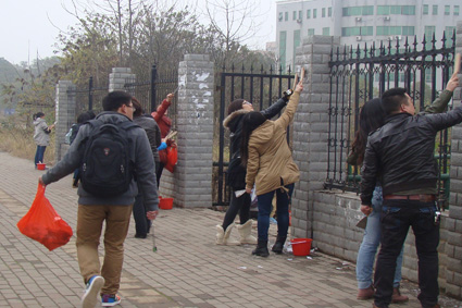 金翰林处在繁华商业地段,小广告和垃圾较多,但是志愿者们热情高涨,在领取工具之后,马上开始工作。处理墙上的小广告,要先用水打湿贴纸,再用铁刷子一点一点刷下去,由于天气寒冷,志愿者们握着刷子的手被冻得通红,但大家都很认真地坚持着。在金翰林桥下的沟里,常年堆积着无人清理的垃圾,社区志愿者和51大赛