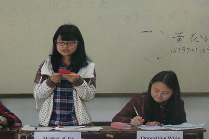 洪依璇在接下来的陈词中首先反驳到:“对方一辩只强调了遇到困难的人的利益,而忽略了帮助者的利益。”接着,她又陈述了自己的观点,“强制人们去帮助他人是限制人民权利和自由的表现,是极不合理的。我们应该以道德的方法去约束人民群众,使人们自然而然的去为他人提供帮助。”在接下来的比赛中,正方主要围绕“法律武器能够更高效的促使人们去帮助他人,会使我们的社会更加和谐”这个观点进行辩论。反方主要以“人民应有自己行使的权利和自由”这一观点进行反击。