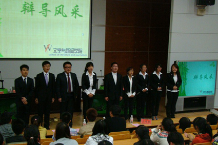 表演赛结束,在大家整齐响亮的口号声中,新生辩导一一登台亮相,随即新生班级代表上台抽取预选赛班级和辩题,最终,将在下周参加预选赛的两个班级为12广告1班和12中文1班。