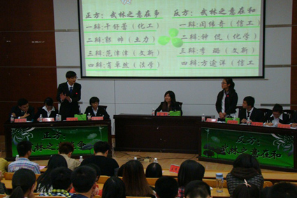 接着,比赛进入双方三辩质询对方四辩的环节。双方辩手在此环节中,你来我往,各不退让,精彩的语言、生趣的实例引得现场掌声连连。双方在“争的目的是什么”“武林有争是否等同于武林之意在争”“争到何种程度才是意”这一些列问题上展开激烈交锋。在质询小结中,正方三辩指出武林之意是通过争来实现,而争到何种程度才是意与辩题无关;反方三辩指责对方偷换辩题,并提出争是未完待续,和才是全剧终这一观点。