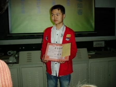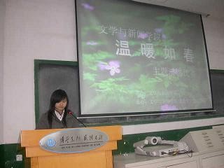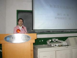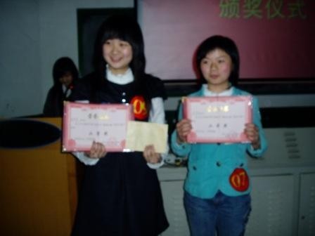 在选手演讲结束后,工作人员在紧张的统分,会场进行的是“2007年暑期社会实践调查报告”颁奖,由覃岚老师进行颁奖,06中文一班张鼎盛、秦蓁获得一等奖,06新闻二班王可心获得二等奖,06广播电视新闻一班的孙丽娜、王玥雯和06新闻二班的白庆虹获得三等奖,06级广播电视新闻一班荣获“优秀实践班集体”称号。