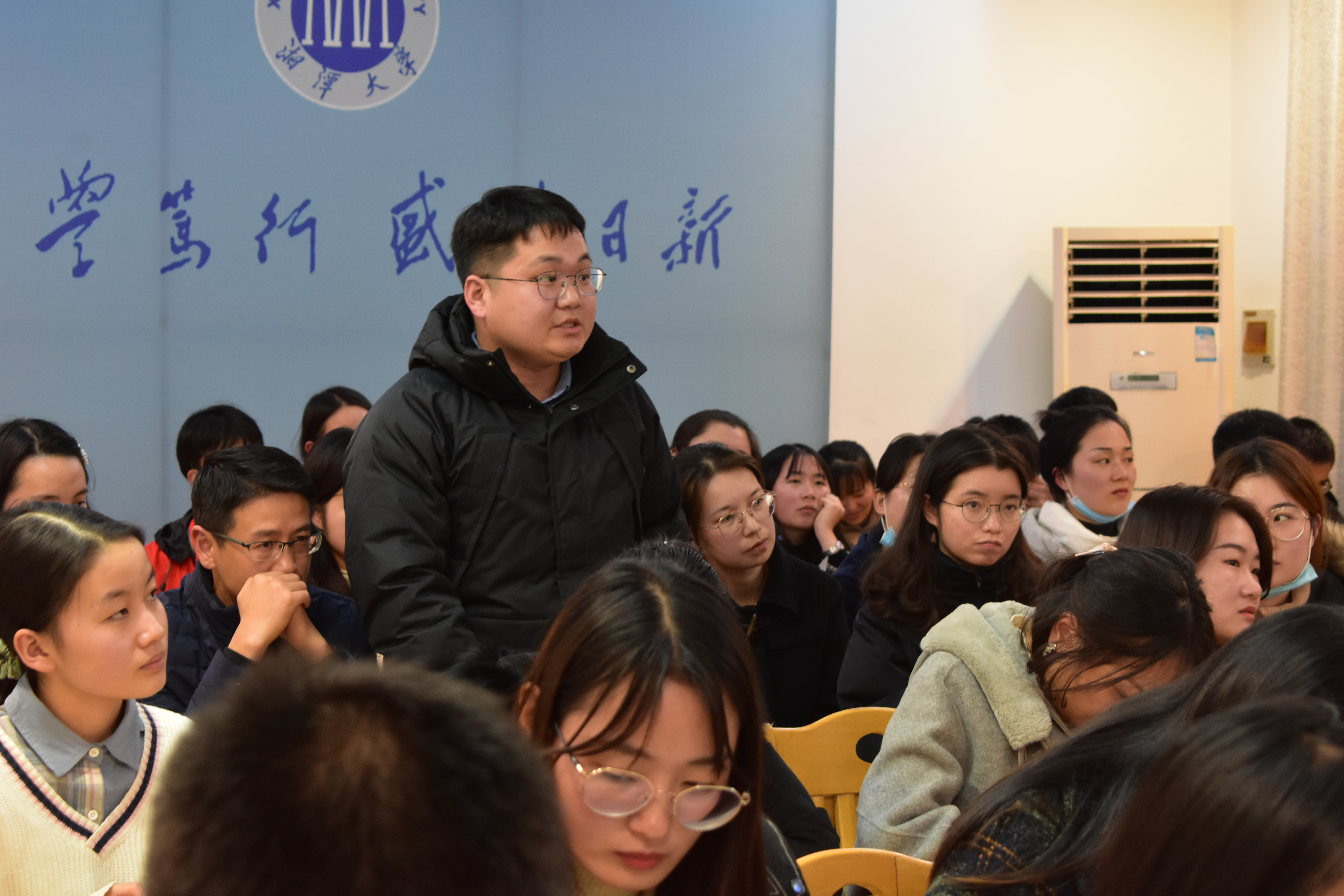 在提问互动环节,现场师生纷纷向何诗海教授表达由衷敬佩,并就分析资料如何深入等问题向教授虚心请教,何诗海教授对大家的问题一一做出了详细的解答,并教导在座各位,读书是一个积累、学习的过程,要分阶段地制定读书计划,前期不必急功近利。即“入门要正”,不带任何成见地去阅读。同时,何教授倡导大家在分析资料时要挖掘其独特性和唯一性。