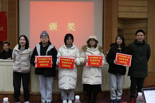 尹冰雪等25人获得资助,到场嘉宾为奖助学金获得者颁奖并合影留念。