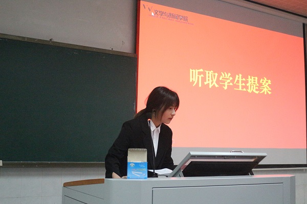 最后,管胜昔老师总结道:要齐心协力,担当责任,广泛听取学生呼声,畅通师生交流渠道;守正创新,开创新篇,在传承优良传统的基础上进行革新;调整身心,追逐梦想,要密切关注学生身心健康,鼓励学生走出书斋,投身实践,在磨炼中开阔视野,锤炼自我。