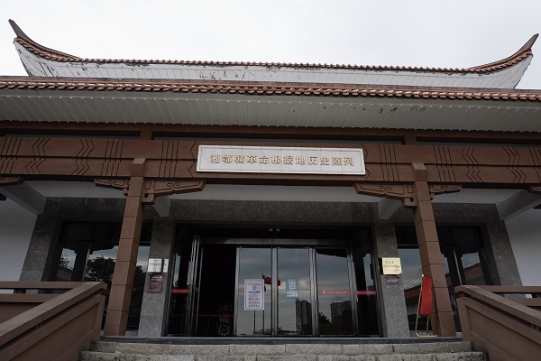 湘鄂赣革命根据地纪念馆旧址为一栋普通土木结构民房,1956年列为湖南省重点文物保护单位。有关其文物发掘保护情况及纪念馆的发展,团队成员邀请了金馆长对其进行了介绍:纪念馆地处平江县城三犊源花果山,占地11亩,建筑面积3800平方米,殿出面积1040平方米,是平江县一处靓丽的人文景观,也是一处新兴的爱国主义教育基地。团队成员在参观中发现,该馆为琉璃翘檐回廊仿古式结构,馆舍分别由主馆、门楼、广场、台阶、草坪等构成。究其历史原因则是1934年国民党政府派军队对湘鄂赣根据地发动第五次"围剿",湘鄂赣省级机关被迫从江西万载小源撤出,于1934年7月转移到这里。