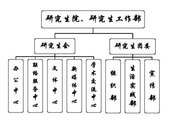 研究生会、研究生团委下设八个部门,分别是办公中心、联络服务中心、学术交流中心、文体中心、新媒体中心、组织部、生活实践部、宣传部。