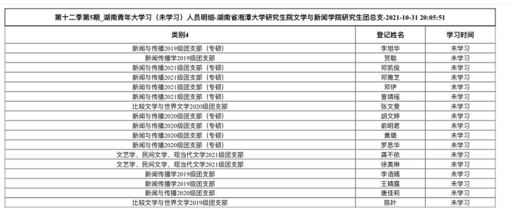 青年大学习第十二季第5期学习已截止,截止时间为10月31日晚七点。现将未学习名单公布如下。请各团支部书记今后务必认真督促团支部成员,落实每周青年大学习的完成。
