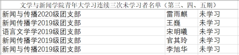 现对学院连续三次(第三期、第四期、第五期)青年大学习未学习同学进行通报批评。